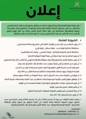 تعلن وزارة الثروة الزراعية والسمكية وموارد المياه عن إطلاق مشروع نشر سلالات الماعز العماني والممول من قبل صندوق التنمية الزراعية والسمكية ويستهدف المشروع إنشاء مؤسسات صغيرة ومتوسطة متخصصة في تربية سلالة الماعز الجبلي، وذلك من خلال توفير قطيع الأساس (عدد 100 رأس من إناث الماعز الجبلي، وعدد 5 ذكور محسنة من نفس السلالة).