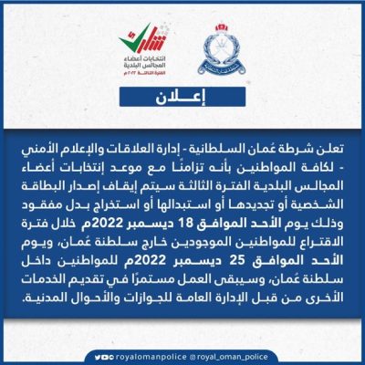 تزامنًا مع موعد إنتخابات أعضاء المجالس البلدية سيتم إيقاف إصدار البطاقة الشخصية أو تجديدها أو استبدالها أو استخراج بدل مفقود وذلك يوم الأحد الموافق 18 ديسمبر 2022م خلال فترة الاقتراع للمواطنين الموجودين خارج سلطنة عمان، ويوم الأحد الموافق 25 ديسمبر 2022م للمواطنين داخل سلطنة عمان