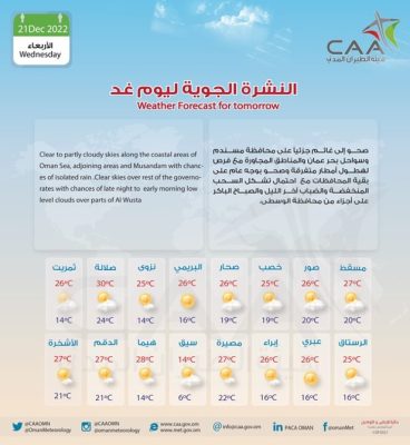 وهج الخليج - مسقط تكاثف السحب المنخفضة على المناطق المطلة على بحر عمان وأجزاء من سواحل الوسطى كما تنتشر السحب العالية بشكل متفرق على أجزاء من محافظة ظفار