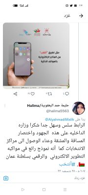 وقالت حليمة حمد اليعقوبية عبر صفحتها الرسمية على تويتر ، إن الرابط سلس وسهل جدا شكرا وزارة الداخلية على هذه الجهود واختصار المسافة والمشقة وعناء الوصول الى مراكز الانتخابات كما أنه نموذج رائع في مواكبة التطوير الالكتروني والرقمي بسلطنة عمان 🇴🇲. #أنتخب