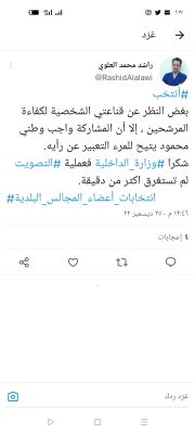 وقال راشد محمد العلوي عبر تويتر ،بغض النظر عن قناعتي الشخصية لكفاءة المرشحين ، إلا أن المشاركة واجب وطني محمود يتيح للمرء التعبير عن رأيه،شكرا #وزارة_الداخلية فعملية #التصويت لم تستغرق اكثر من دقيقة.