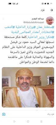 بينما أثنى عبد الله المقدم عبر صفحته الرسمية على توتير حيث قال ، كلمة شكر مستحقة نسجلها لمعالي السيد حمود بن فيصل البوسعيدي الموقر وزير الداخلية على النظام الجديد للتصويت والذي تميز بالسرعة والسهولة والمثالية فشكرا على ماتقدمه دائما لخدمة الوطن والمواطن