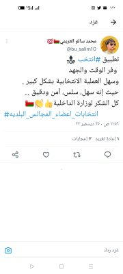 وأكد عدد كبير من المواطنين في سلطنة عُمان عبر وسائل التواصل الاجتماعي عن رضاهم عن طبيق انتخب”حيث أشادوا بسهولة استخدامه وفاعليته، وهذا ينم عن الجهود المبذولة من قبل وزارة الداخلية وحرصها على سير العملية الانتخابية بكل سهولة ويسر ليتسنى للمواطنين تديتهم حقهم الانتخابي.