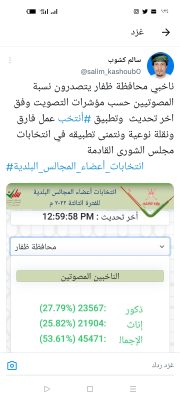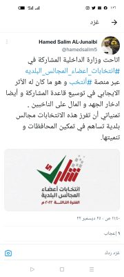 وأضاف حامد سليم الجينبي عبر تغريدة على تويتر ، اتاحت وزارة الداخلية المشاركة في #انتخابات_اعضاء_المجالس_البلديه عبر منصة #أنتخب و هو ما كان له الأثر الايجابي في توسيع قاعدة المشاركة و أيضا ادخار الجهد و المال على الناخبين ،تمنياتي أن تفرز هذه الانتخابات مجالس بلدية تساهم في تمكين المحافظات و تنميتها.