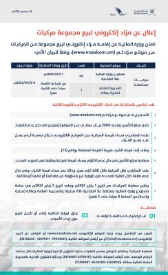 وهج الخليج - مسقط أعلنت وزارة المالية عن مزاد إلكتروني لبيع مجموعة من المركبات عبر موقع مزادكم. اليكم التفاصيل: