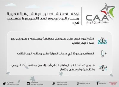 ، وانخفاض ملحوظ في درجات الحرارة على معظم المحافظات،فرص تصاعد الغبار والأتربة على أجزاء من محافظات البريمي والظاهرة والوسطى وظفار.