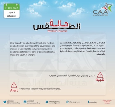 الرئيسية/أخبار محلية/أجواء غائمة إلى غائمة جزئيًا على معظم المحافظات الشمالية لسلطنة عمان أخبار محلية أجواء غائمة إلى غائمة جزئيًا على معظم المحافظات الشمالية لسلطنة عمان31/12/2022. 31/12/2022وهج الخليج – مسقطShare on:WhatsApp31/12/2022. 31/12/2022 فيسبوك X لينكدإن Tumblr بينتيريست Reddit VKontakte مشاركة عبر البريد طباعة