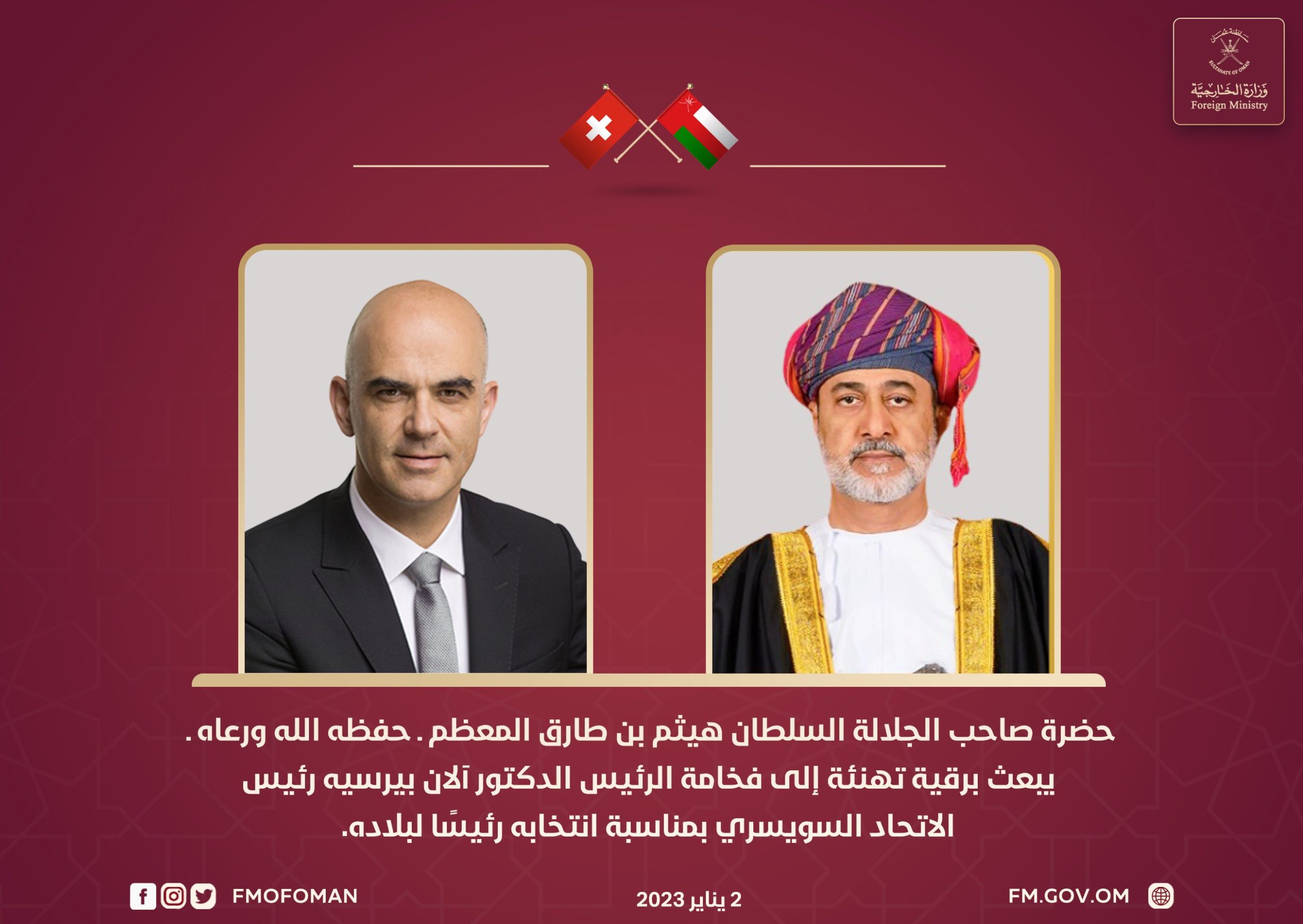 حضرة صاحب الجلالة السلطان المعظم ـ حفظه الله ورعاه ـ يبعث برقية تهنئة إلى فخامة الرئيس الدكتور آلان بيرسيه رئيس الاتحاد السويسري بمناسبة انتخابه رئيسًا لبلاده.