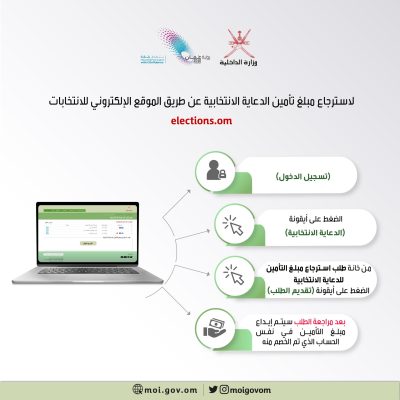 أعلنت وزارة الداخلية عبر حسابها الرسمي على صفحة التواصل الاجتماعي تويتر، عن استرجاع مبلغ تأمين الدعاية الانتخابية عن طريق الموقع الإلكتروني للانتخابات ،elections.om ، وذلك باتباع الخطوات الموضحة بالجدول التالى: