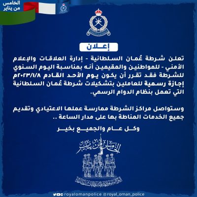 تعلن شرطة عُمان السلطانية – إدارة العلاقات والإعلام الأمني – للمواطنين والمقيمين أنه بمناسبة اليوم السنوي للشرطة فقد تقرر أن يكون يوم الأحد القادم ٨/١/٢٠٢٣م إجازة رسمية للعاملين بتشكيلات شرطة عُمان السلطانية التي تعمل بنظام الدوام الرسمي