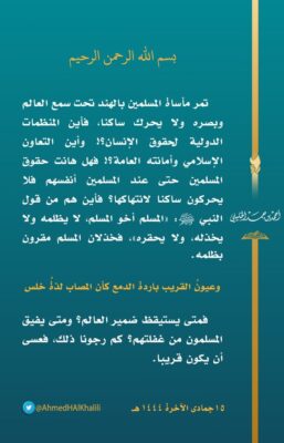 نشر سماحة الشيخ أحمد بن حمد الخليلي المفتي العام للسلطنة عبر حسابه الرسمي على منصة تويتر” تمر مأساة المسلمين بالهند تحت سمع العالم وبصره ولا يحرك ساكنا، فأين المنظمات الدولية لحقوق الإنسان؟! وأين التعاون الإسلامي وأمانته العامة؟! فهل هانت حقوق المسلمين حتى عند المسلمين أنفسهم فلا يحركون ساكنا لانتهاكها؟