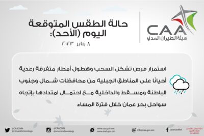 وهج الخليج - مسقط تستمر فرص هطول الأمطار اليوم على المناطق الجبلية من محافظات شمال وجنوب الباطنة ومسقط والداخلية مع فرص امتدادها بإتجاه سواحل بحر عمان مساءً.