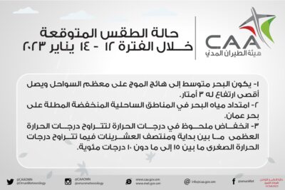 أعلنت هيئة الأرصاد الجوية ان حالة الطقس المتوقعة خلال الفترة ١٢ – ١٤ يناير ٢٠٢٣، ويكون البحر متوسط إلى هائج الموج على معظم السواحل ويصل أقصى ارتفاع له ٣ أمتار.