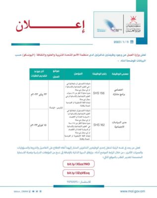 وهج الخليج - مسقط تعلن وزارة العمل عن وجود وظائف شاغرة لدى منظمة الأمم المتحدة للتربية والعلوم والثقافة (اليونسكو) حسب البيانات المحددة للتسجيل كما يلى: