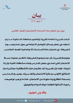 تابعت المديرية العامة للتربية والتعليم لمحافظة الداخلية ما يتم تداوله في بعض وسائل التواصل الاجتماعي حول عدم وضوح الخريطة في امتحان مادة الدراسات الاجتماعية للصف الخامس.