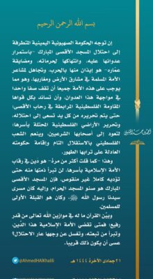 إن توجه الحكومة الصهيونية اليمينية المتطرفة إلى احتلال المسجد الأقصى المبارك إيذان منها بالحرب، يوجب على الأمة الإسلامية أن تقف صفا واحدا في مواجهته حتى يتم تحريره وتحرير الأراضي الفلسطينية المحتلة بأسرها.