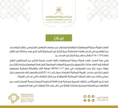 حول المقطع المتداول عبر منصات التواصل الاجتماعي بشأن قيام عدد من الوافدين في إحدى ولايات السلطنة ببيع التبغ غير الممضوغ.