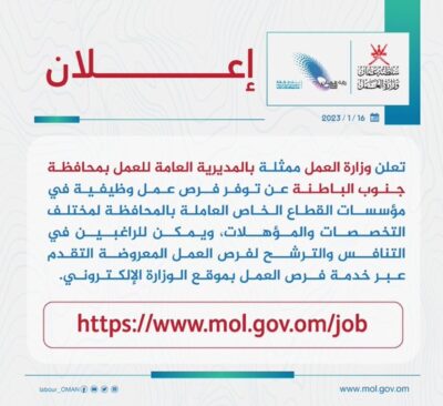 تعلن وزارة العمل ممثلة بالمديرية العامة للعمل في محافظة جنوب الباطنة عن توفر فرص عمل وظيفية في مؤسسات القطاع الخاص العاملة بالمحافظة لمختلف التخصصات والمؤهلات، للتقدم على الفرص الوظيفية يرجى دخول خدمة فرص العمل بموقع الوزارة الإلكتروني.