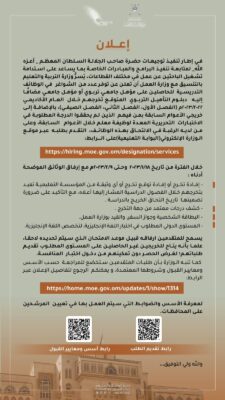في إطار تنفيذ توجيهات حضرة صاحب الجلالة السلطان المعظم – أعزه الله لمتابعة تنفيذ البرامج والمبادرات الخاصة بما يساعد على استدامة تشغيل الباحثين عن عمل في مختلف القطاعات، يَسرُّ وزارة التربية والتعليم بالتنسيق مع وزارة العمل أن تعلن عن توفر عدد من الشواغر في الوظائف التدريسية للحاصلين على مؤهل جامعي تربوي أو مؤهل جامعي .