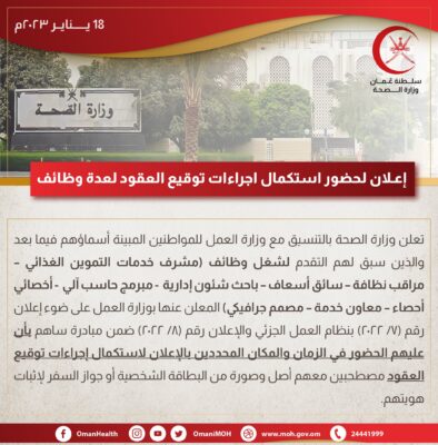 اعلنت وزارة الصحة بالتنسيق مع وزارة العمل للمواطنين المبينة أسماؤهم في الرابط أدناه والذين سبق لهم التقدم لشغل الوظائـف المعلن عنها بوزارة العمل، بأن عليهم الحضور في الزمان والمكان المحددين بالإعلان لاستكمال إجراءات توقيع العقود.