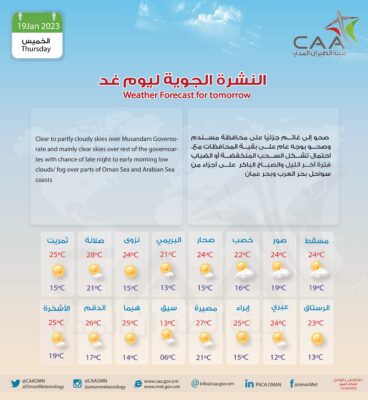 أعلنت هيئة الأرصاد الجوية عن حالة الطقس ليوم الغد ،حيث هبوب رياح شمالية غربية مع انخفاض نسبي في درجات الحرارة واحتمال تصاعد الغبار في المناطق المكشوفة والصحراوية.