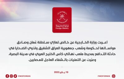 أعربت وزارة الخارجية عن خالص تعازي سلطنة عُمان وصادق مواساتها لحكومة وشعب جمهورية ⁧‎ العراق⁩ الشقيق ⁩ولذوي الضحايا في حادثة التدافع بمحيط ملعب نهائي ‎كأس الخليج العربي في مدينة البصرة، وعبّرت عن التمنيات بالشفاء العاجل للمصابين.