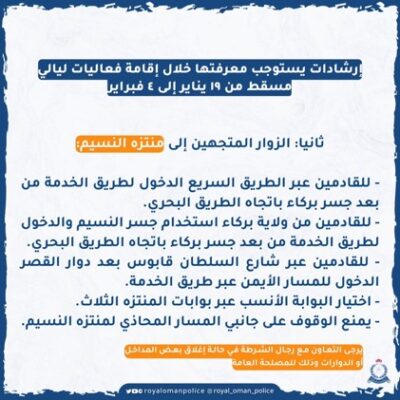 إرشادات المسارات خلال إقامة فعاليات ليالي مسقط من ١٩ يناير وحتى ٤ فبراير ٢٠٢٣م.