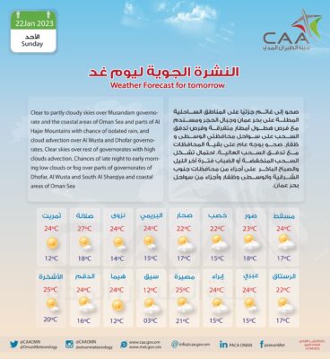 وهج الخليج - مسقط نشرت هيئة الأرصاد الجوية على صفحتها على موقع التواصل الاجتماعي تويتر عن توقعات درجات الحرارة ليوم الغد الأحد.
