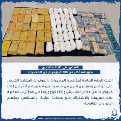 وهج الخليج - مسقط القبض على ثلاثة متهمين بحوزتهم أكثر من 100 كيلوجرام من المخدرات..