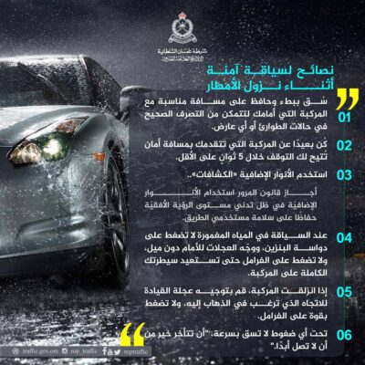 وكانت النصائح لسياقة آمنة أثناء نزول الأمطار كالأتي: