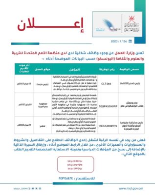 تعلن وزارة_العمل عن وجود فرص وظيفية لدى منظمة الأمم المتحدة للتربية والعلوم والثقافة (اليونسكو) ، فعلى من يجد في نفسه الرغبة لشغل إحدى الوظائف الشاغرة الاطلاع على التفاصيل من خلال الرابط لكل وظيفة: