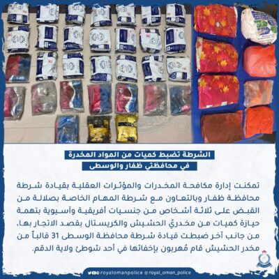 ضبطت شرطة عُمان السُلطانيه كميات من المواد المخدرة في محافظتي ظفار والوسطى.