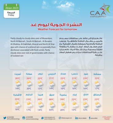 وهج الخليج - مسقط أعلنت هيئة الأرصاد الجوية عبر صفحتها الرسمية على موقع التواصل الاجتماعي تويتر عن حالة الطقس ليوم غد كما يلي: