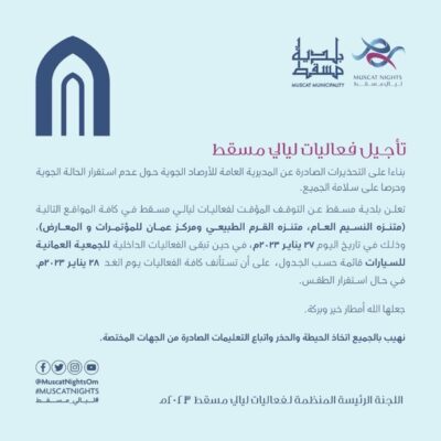 نظرًا للظروف المناخية.. بلدية مسقط تعلن عن تأجيل فعاليات ليالي مسقط اليوم