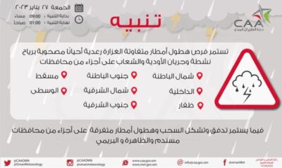 وهج الخليج - مسقط أصدرت الأرصاد الجوية العمانية تنبيها حول استمرار فرص هطول أمطار متفاوتة الغزارة رعدية أحيانًا مصحوبة برياح نشطة وجريان الأودية والشعاب على عدد من محافظات سلطنة عُمان.