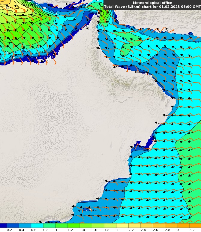 نشرت هيئة الأرصاد الجوية عبر صفحتها الرسمية على موقع التواصل الاجتماعي تويتر عن حالة البحر ليوم الغد، بحر متوسط الموج على سواحل مسندم(مترين) وهادئ إلى متوسط الموج على طول سواحل بحر عٌمان وبحر العرب(1.25 – 2.0)متر.