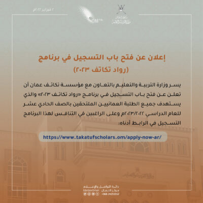أعلنت وزارة التربية والتعليم عن فتح باب التسجيل في برنامج “رواد تكاتف 2023” الذي يستهدف جميع الطلبة العمانيين الملتحقين بالصف الحادي عشر للعام الدراسي 2022/2023م.