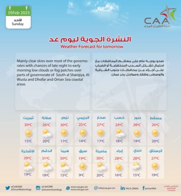 وهج الخليج - مسقط أعلنت هيئة الأرصاد الجوية عبر صفحتها الرسمية على موقع التواصل الاجتماعي تويتر عن حالة الطقس ليوم غد السبت.