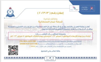 أعلنت وزارة العمل بالتنسيق مع شرطة عمان السلطانية عن فتح باب التجنيد لحملة الدبلوم ما بعد دبلوم التعليم العام (ذكور)، ابتداء مـن يوم الأربعاء وحتى يوم الثلاثاء الموافق 14/2/2023