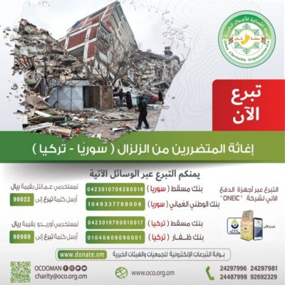 الجمعية العمانية للأعمال الخيرية تدعو التبرع لمتضررين زلزال تركيا وسوريا