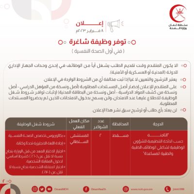 أعلنت وزارة الصحة بالتنسيق مع وزارة العمل عن توفر وظيفة شاغرة ( فني أول الصحة النفسية)، فعلـى مـن يجـد فـي نفسـه الرغبـة لشـغل هذه الوظيفة ويكون مسـتوفياً للشروط المحددة مراجعة ديوان عام وزارة الصحة (دائرة التعيينات والتنقلات).