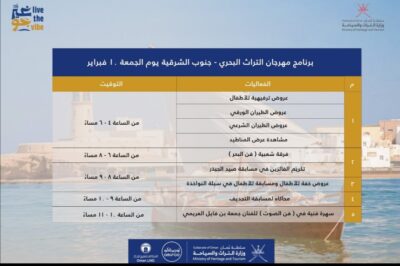 نشرت وزارة التراث والسياحة عبر منصة التواصل الاجتماعي تويتر عن جدول فعاليات اليوم الجمعة في ‎مهرجان التراث البحري العماني بولاية صور. كما هو موضح أدناه :