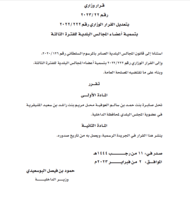 وهج الخليج _ مسقط أصدر معالي حمود بن فيصل البوسعيدي وزير الداخلية قرارا وزاريا رقم 22 لسنة 2023 بتعديل القرار الوزاري رقم 222 لسنة 2022 بتسمية أعضاء المجالس البلدية للفترة الثالثة.