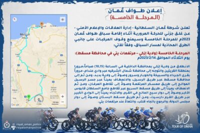 تعلن شرطة عمان السلطانية إدارة العلاقات والإعلام الأمني عن غلق جزئي للحركة المرورية أثناء إقامة سباق طواف عمان 2023م للمرحلة الخامسة وسيمنع وقوف المركبات على جانبي الطرق المحاذية لمسار السباق، وفقاً للصورة المرفقة.