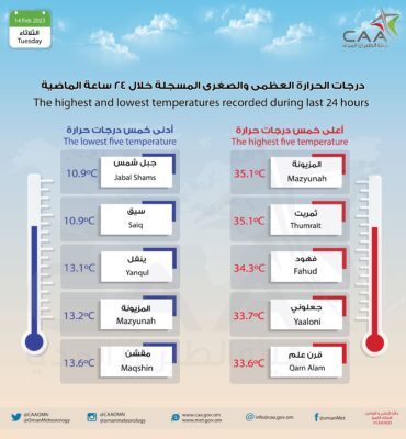 أعلنت هيئة الأرصاد الجوية عبر صفحتها الرسمية على موقع التواصل الاجتماعي تويتر عن درجات الحرارة العظمى والصغرى المسجلة خلال 24 ساعة الماضية