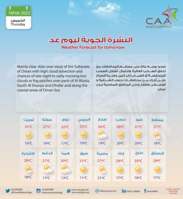 والطقس صحو بوجه عام على معظم المحافظات مع تدفق السحب العالية واحتمال تشكل السحب المنخفضة أو الضباب آخر الليل وفترة الصباح على أجزاء من محافظات جنوب الشرقية و الوسطى وظفار وعلى المناطق الساحلية لبحر عُمان .. وهذه درجات الحرارة العظمى والصغرى :