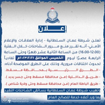أعلنت شرطة عمان السلطانية منع عبور الشاحنات اليوم الخميس في الفترة من الساعة ١٢ ظهرًا وحتى ٤ عصرًا على بعض الطرق الرئيسة حسب المنشور المُرفق :