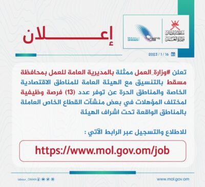 اعلنت وزارة العمل ممثلة بالمديرية العامة للعمل بمحافظة مسقط بالتنسيق مع الهيئة العامة للمناطق الاقتصادية الخاصة والمناطق الحرة عن توفر عدد (15) فرصة وظيفية لمختلف المؤهلات العلمية للاطلاع والتقدم للفرص المعلنة عبر الرابط 🔻