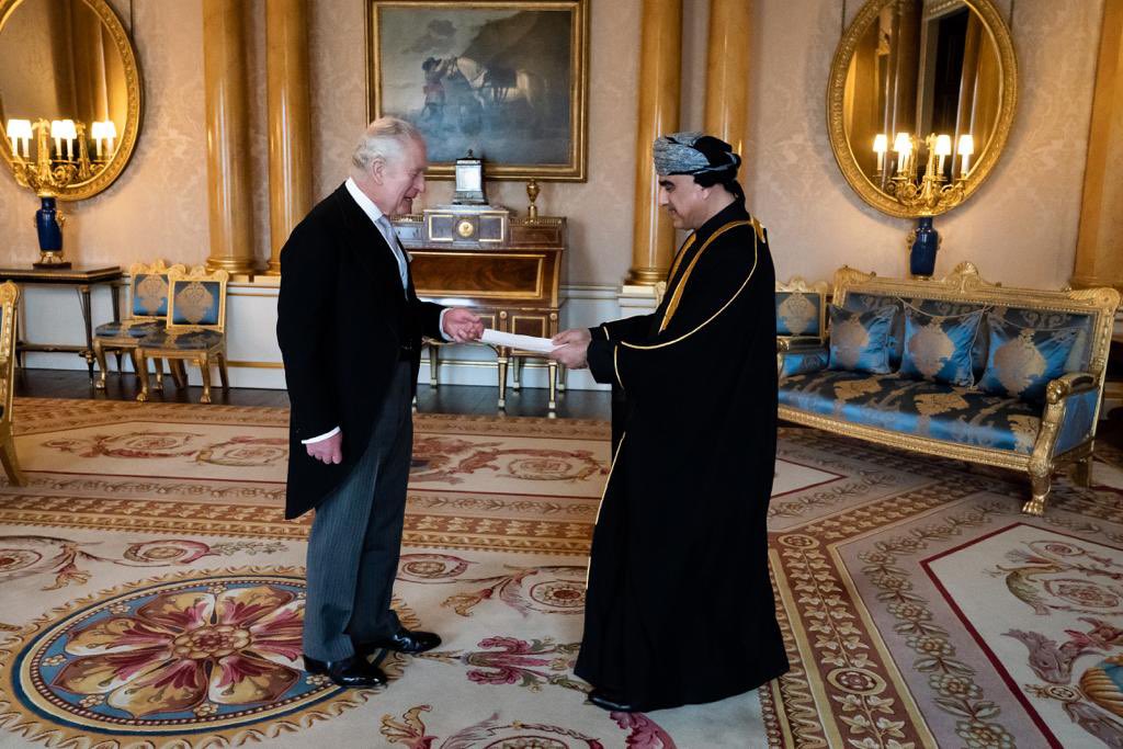أرسل جلالة السُّلطان المعظم /حفظه الله ورعاه/ تحياته إلى جلالة ملك المملكة المتحدة لبريطانيا العظمى وأيرلندا الشمالية ورئيس الكومنولث نقلها سعادة السفير بدر بن محمد المنذري خلال استقبال جلالته له لتقديم أوراق اعتماده سفيرًا لسلطنة عُمان ومفوضًا لدى المملكة المتحدة.