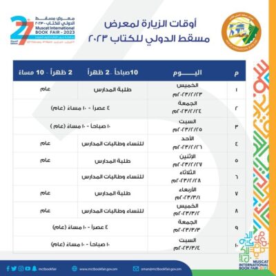 نشر الحساب الرسمي لمعرض مسقط الدولي للكتاب 2023م اوقات الزيارة للمعرض كما هو موضح :